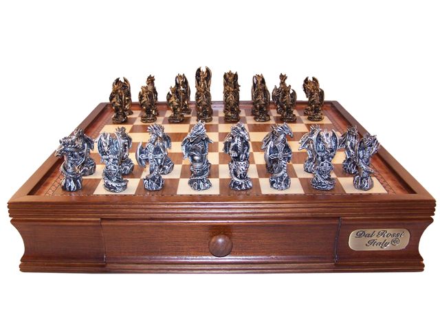 Dal Rossi Italy, Mystical Dragon Chess Set, Pewter, 95mm on Dal Rossi 40cm Chess Box