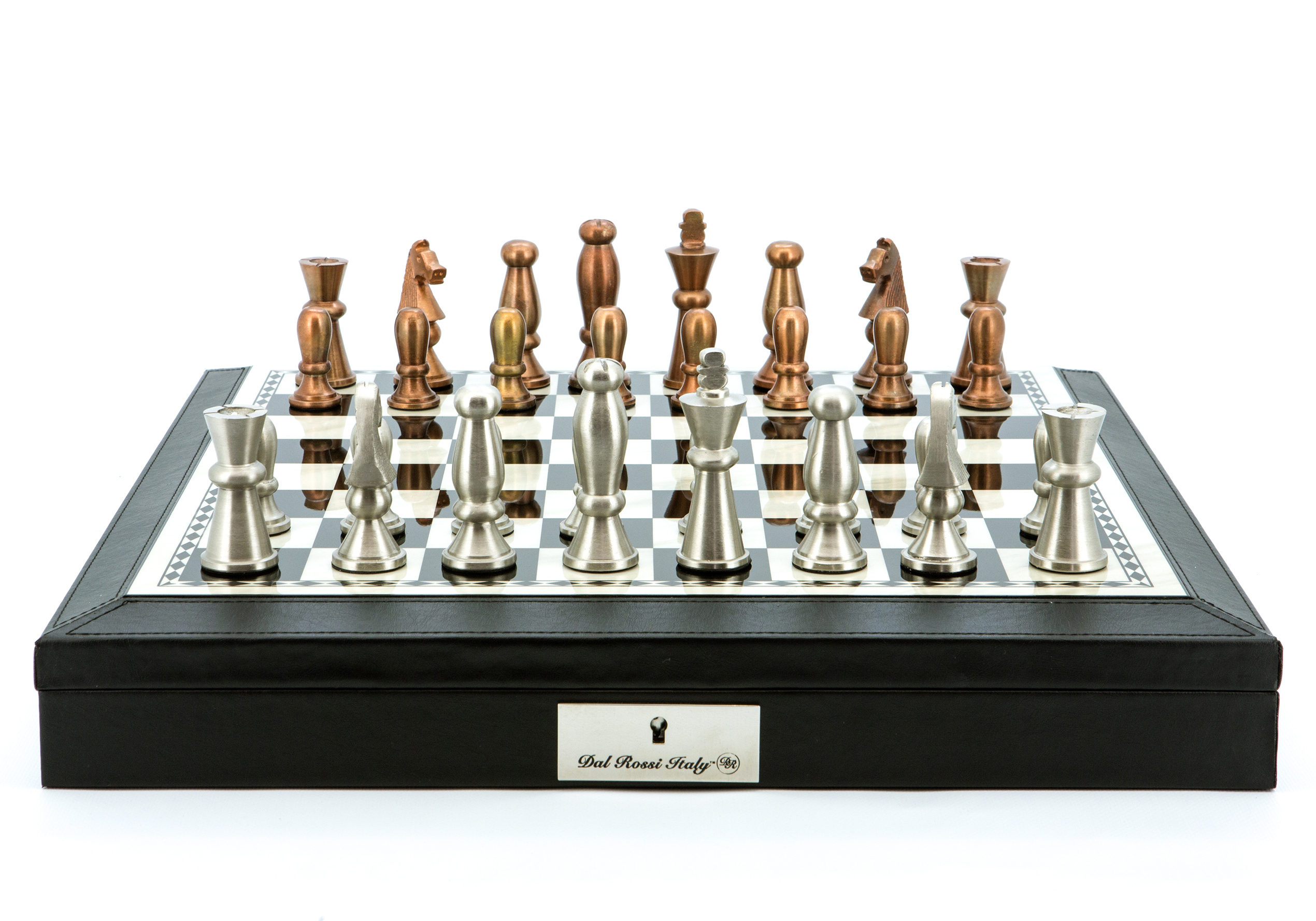 Dal Rossi Italy Chess Set 18” With Black PU Leather Edge with compartments, With Copper & Silver Weighted Metal 85mm Chess Pieces