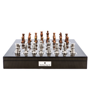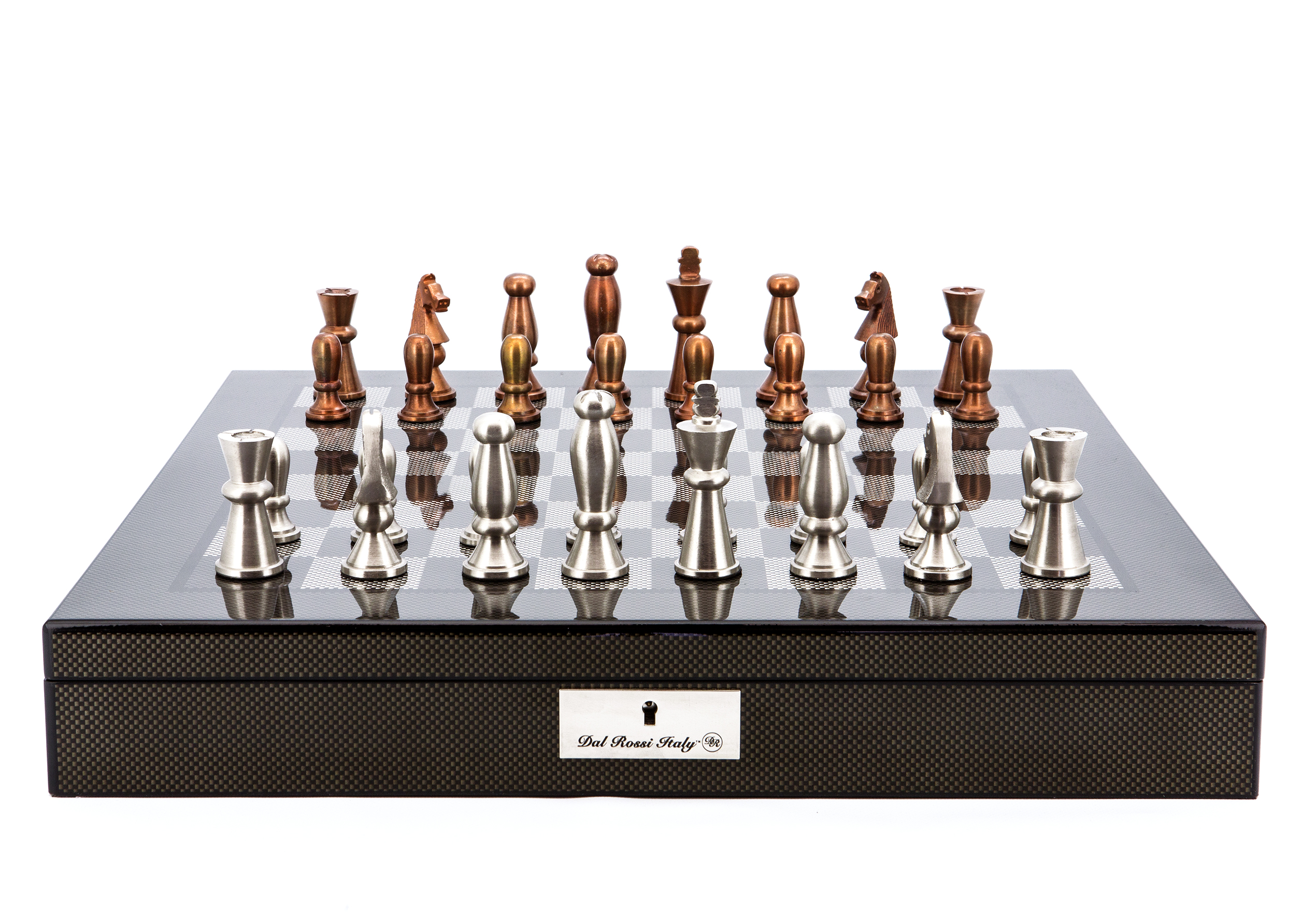 Dal Rossi Italy Chess Set Carbon Fibre Finish 16″ With Compartments, With Copper & Silver Weighted Metal Chess Pieces 85mm pieces