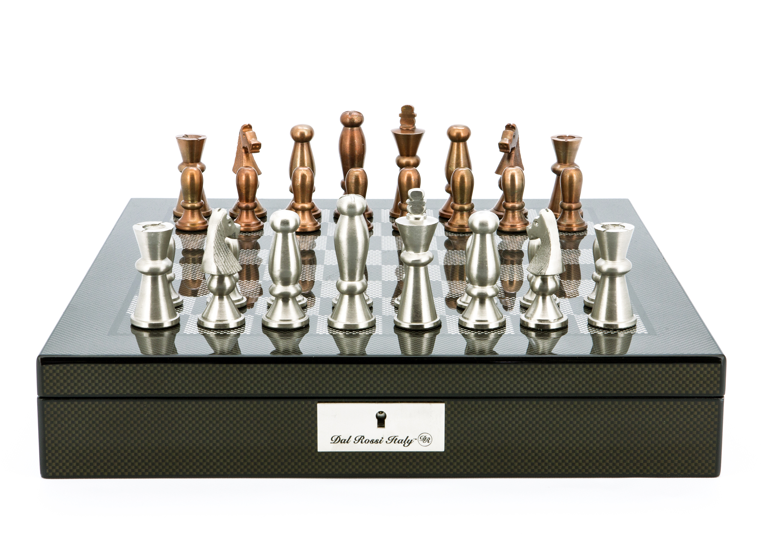 Dal Rossi Italy Chess Set Carbon Fibre Finish 16″ With Compartments, With Copper & Silver Weighted Metal Chess Pieces 85mm pieces