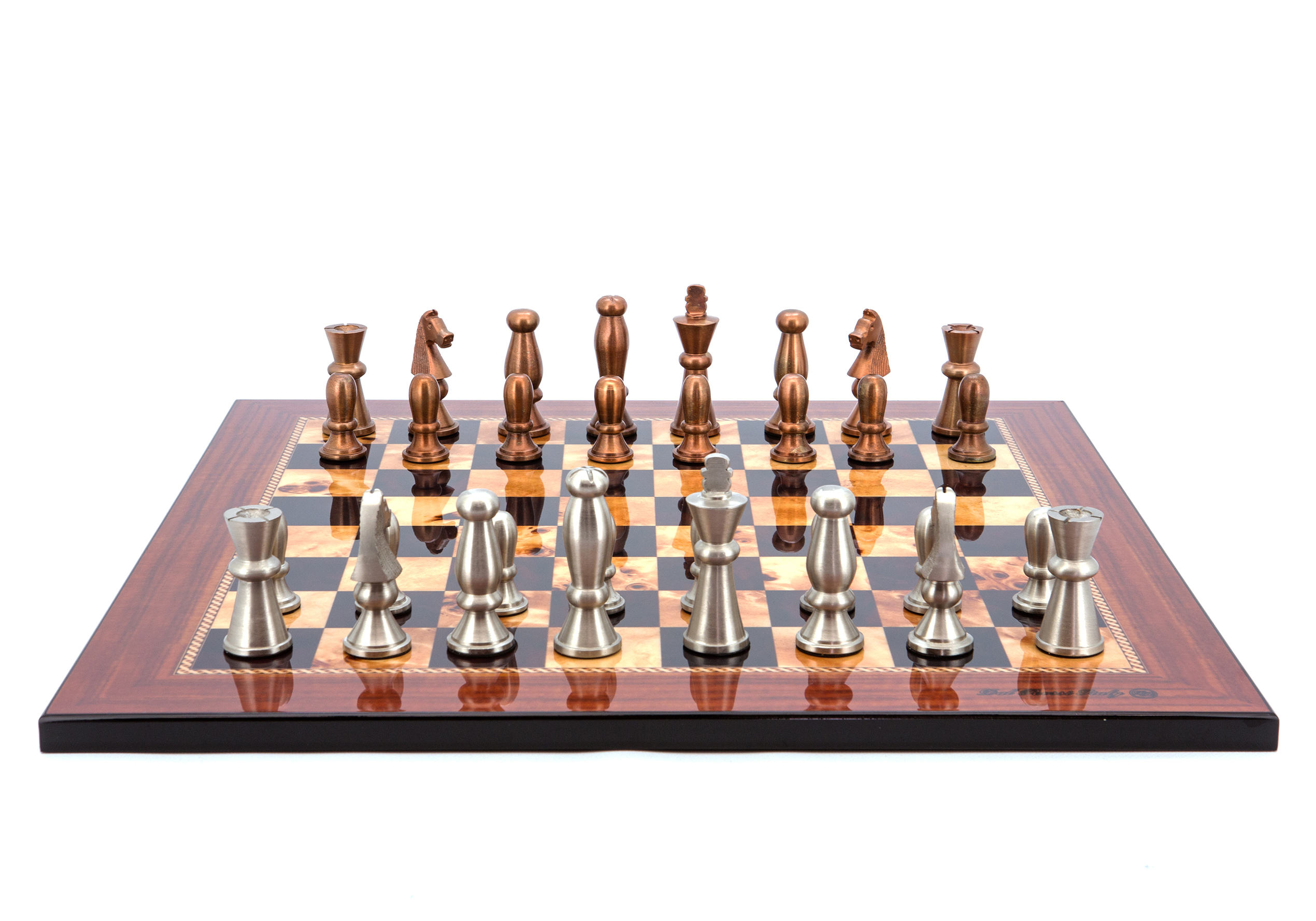 Dal Rossi Italy Chess Set Walnut Finish Flat Board 50cm, With Copper & Silver Weighted Metal Chess Pieces 85mm pieces