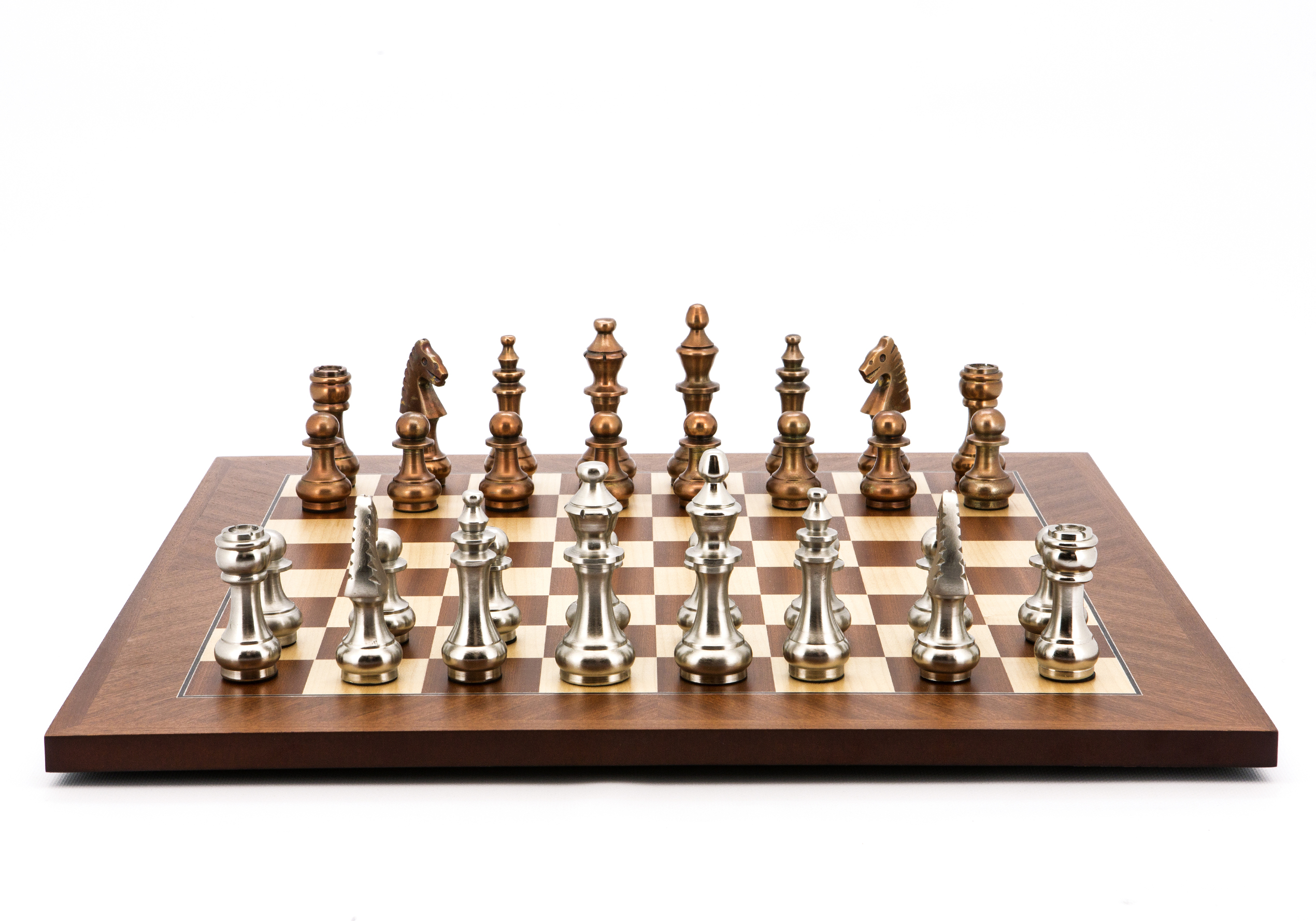 Dal Rossi Italy Chess Set Mahogany Flat Board 50cm, With Copper and Silver Weighted Metal 100mm Chess Pieces