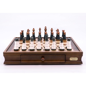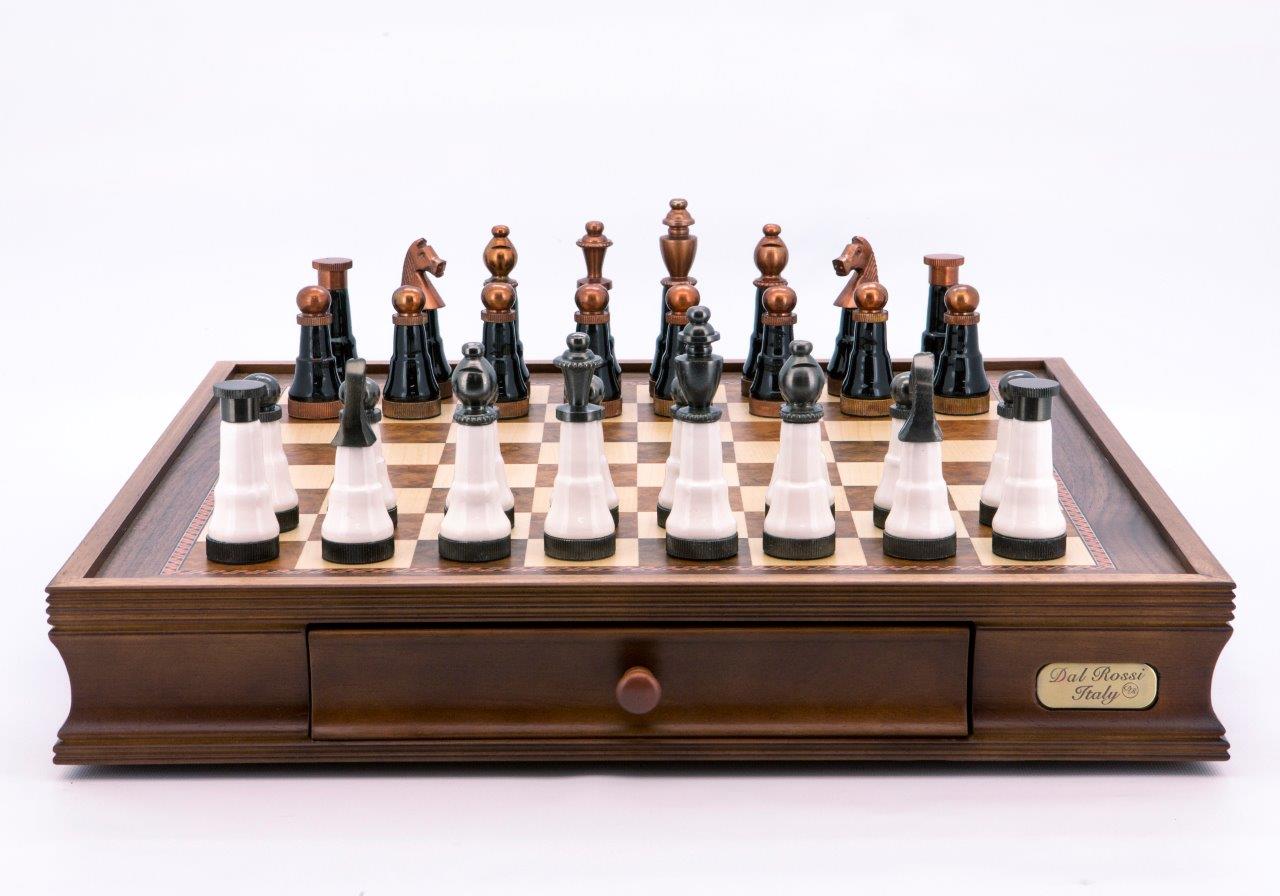 • Dal Rossi Italy Chess Set Walnut Finish 20″ With Two Drawers, With Black and White Copper and Gun Metal Gray Tops Pieces 110mm