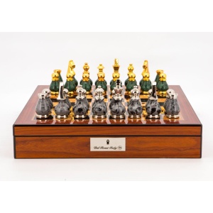 Dal Rossi Italy Chess Set Walnut Finish 16" With Compartments, With Gray and Green Gold and Silver Metal Tops and Bottoms Chess Pieces 90mm