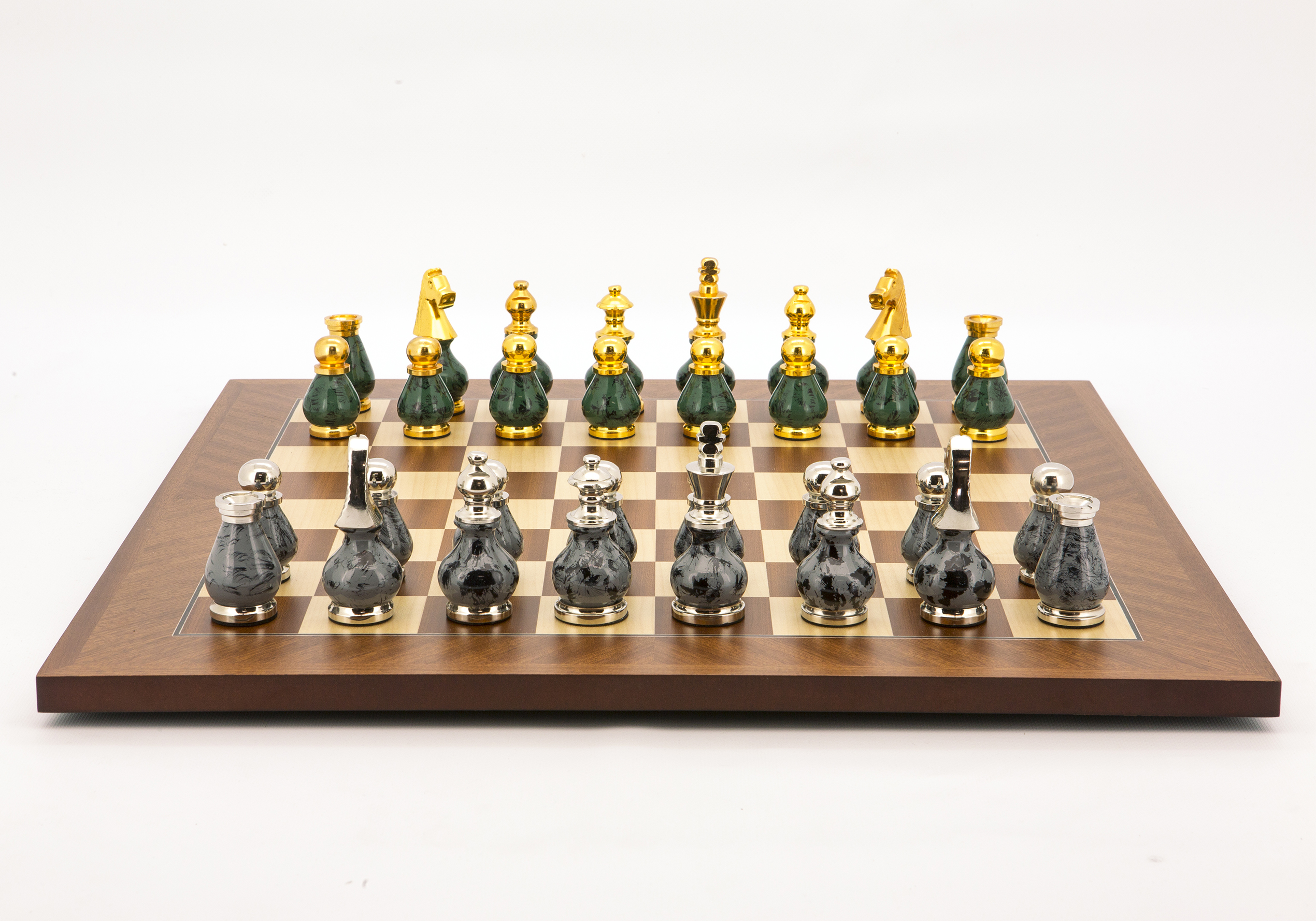 Dal Rossi Italy Chess Set Mahogany Maple Flat Board 50cm, With Gray and Green Gold and Silver Metal Tops and Bottoms Chess Pieces 90mm