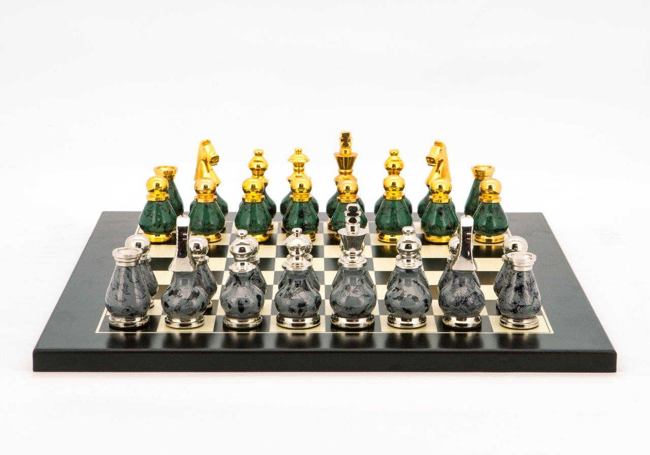 Dal Rossi Italy Chess Set Palisander / Maple Flat Board 50cm, With Gray and Green Gold and Silver Metal Tops and Bottoms Chess Pieces 90mm