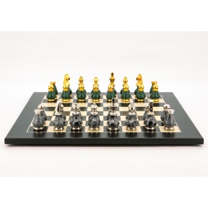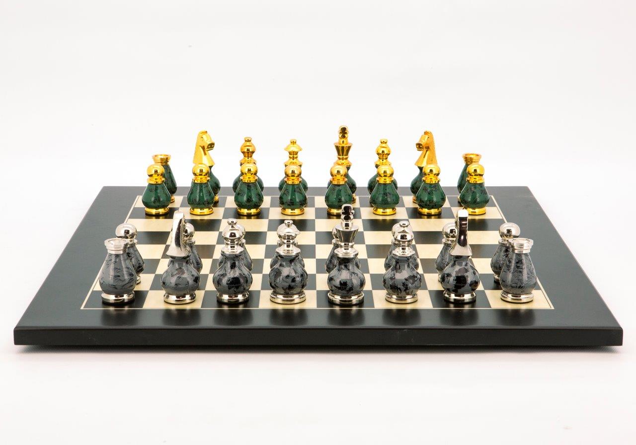 Dal Rossi Italy Chess Set Flat Black/Erable Board 50cm, With Gray and Green Gold and Silver Metal Tops and Bottoms Chess Pieces 90mm