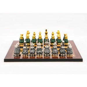Dal Rossi Italy Chess Set Walnut Finish Flat Board 40cm, With Gray and Green Gold and Silver Metal Tops and Bottoms Chess Pieces 90mm