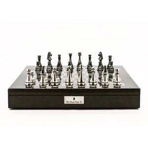 Dal Rossi Italy Chess Set Carbon Fibre Shinny Finish 20″ With Compartments, With Metal Dark Titanium and Silver chessmen 85mm