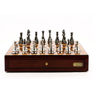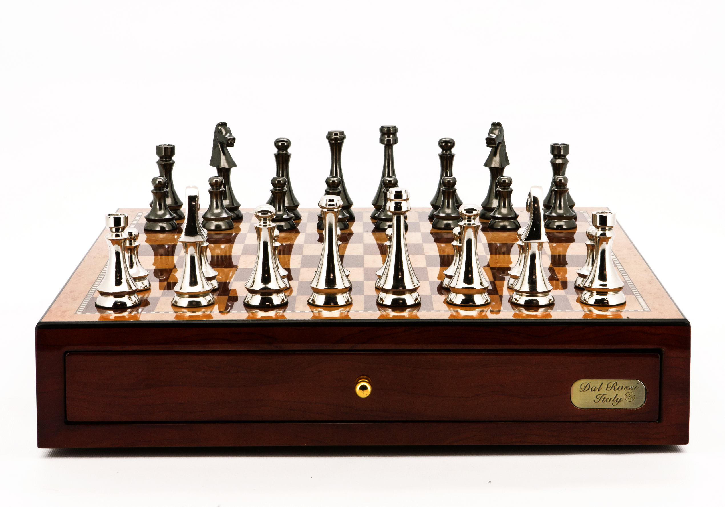 Dal Rossi Italy Chess Set Mahogany Finish 18" With two Drawers, With Metal Dark Titanium and Silver chessmen 85mm