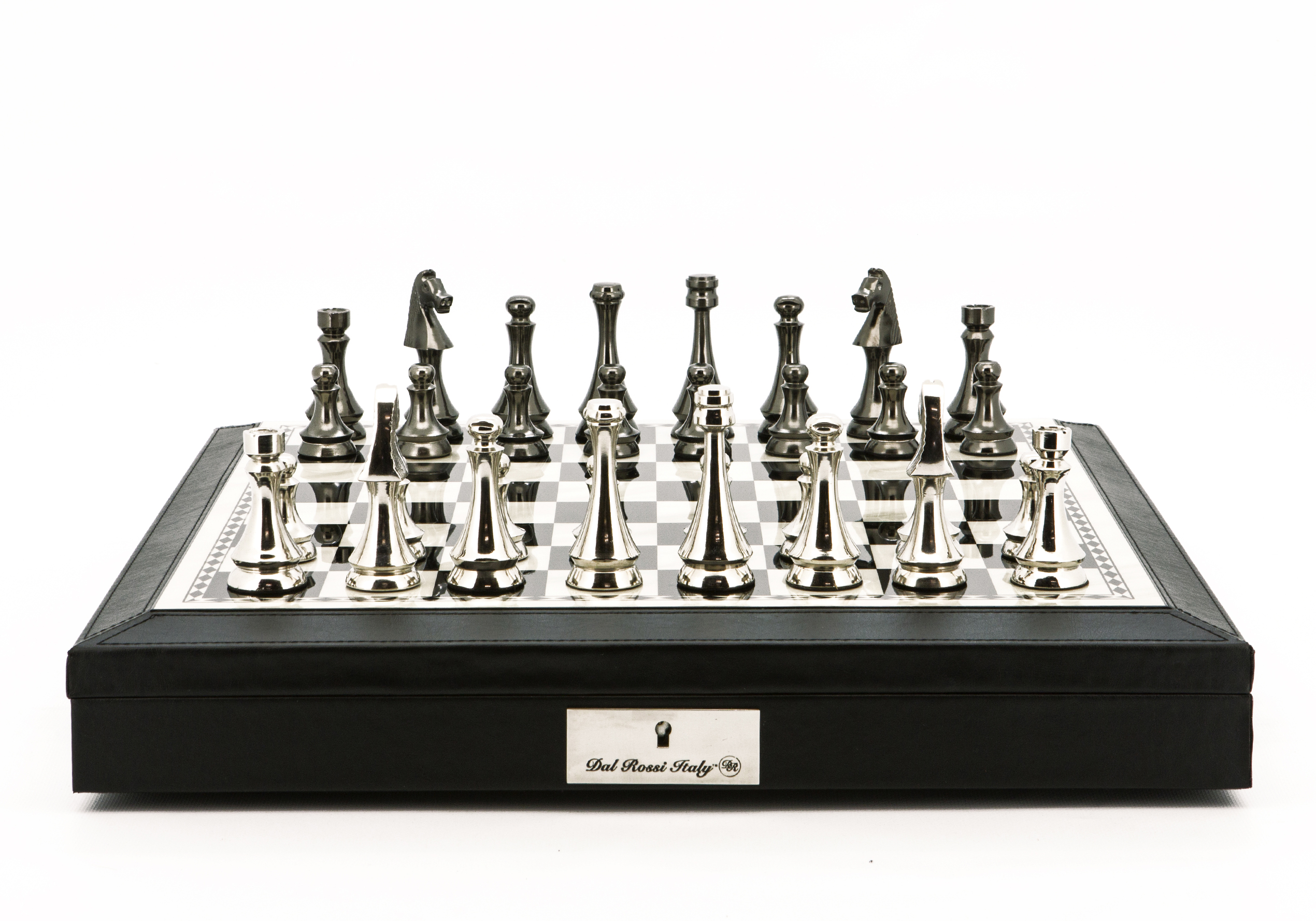 Dal Rossi Italy Chess Set 18” Black and White with Black PU Leather Edge with compartments, With Metal Dark Titanium and Silver chessmen 85mm