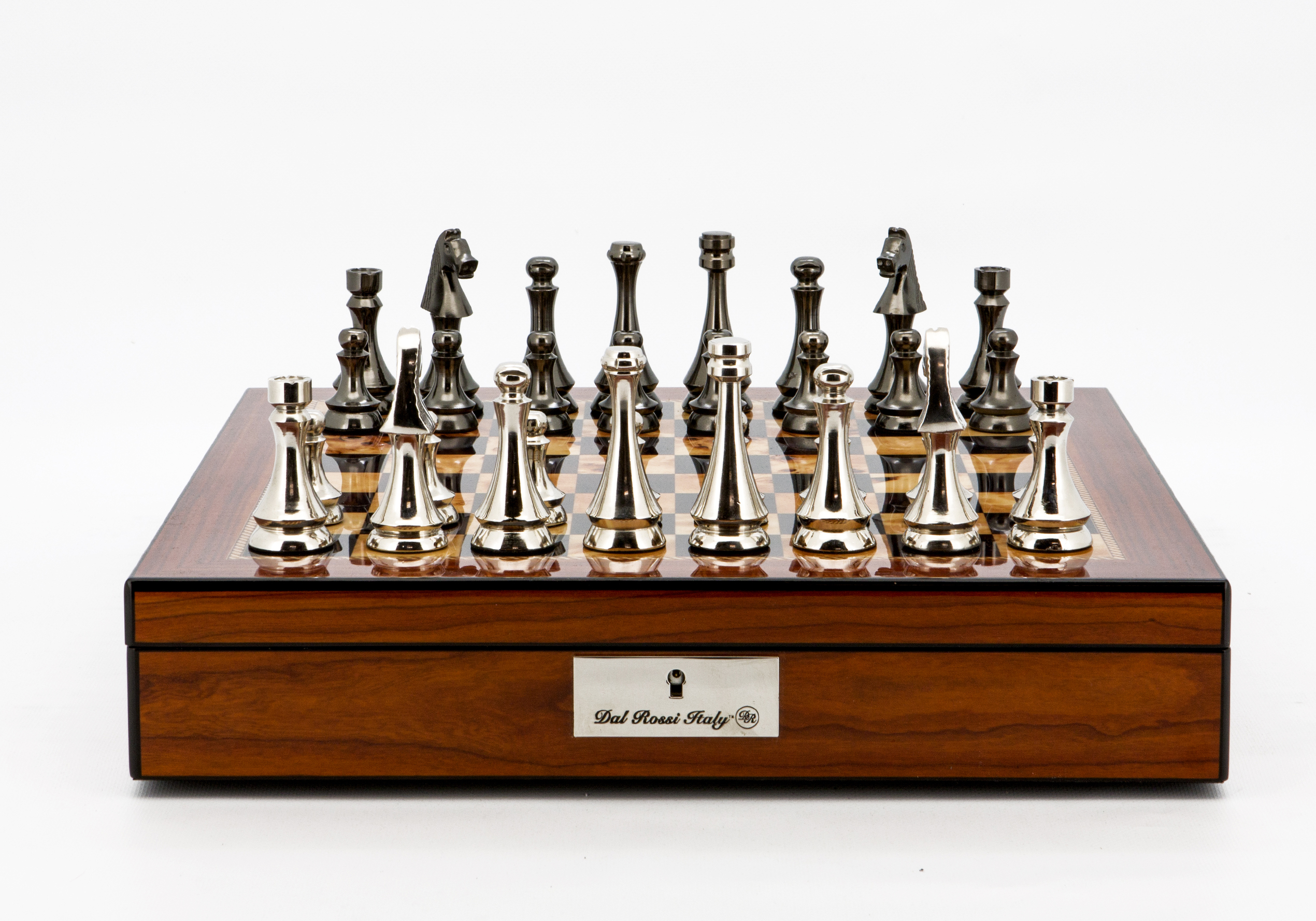 Dal Rossi Italy Chess Set Walnut Finish 16″ With Compartments, With Metal Dark Titanium and Silver chessmen 85mm