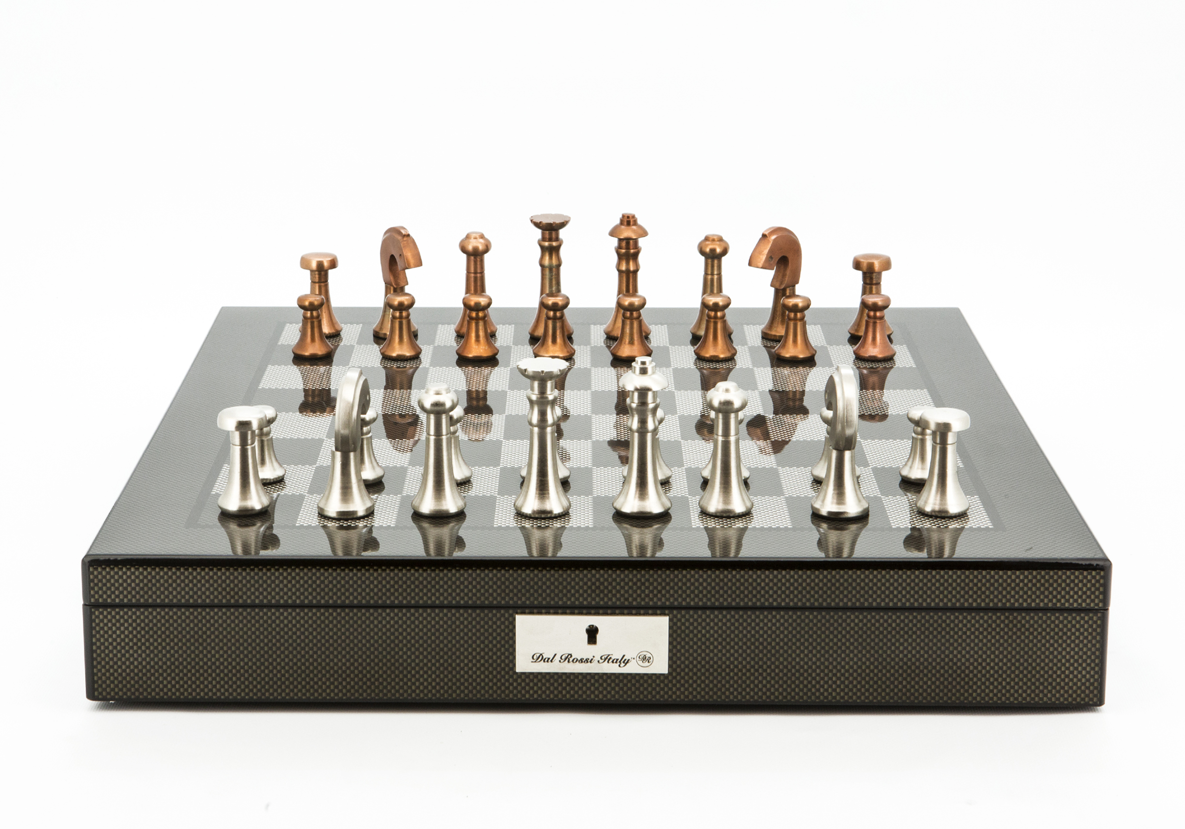 Dal Rossi Italy Chess Set Carbon Fibre Shinny Finish 20″ With Compartments, With Metal Copper and silver Chessmen 80mm