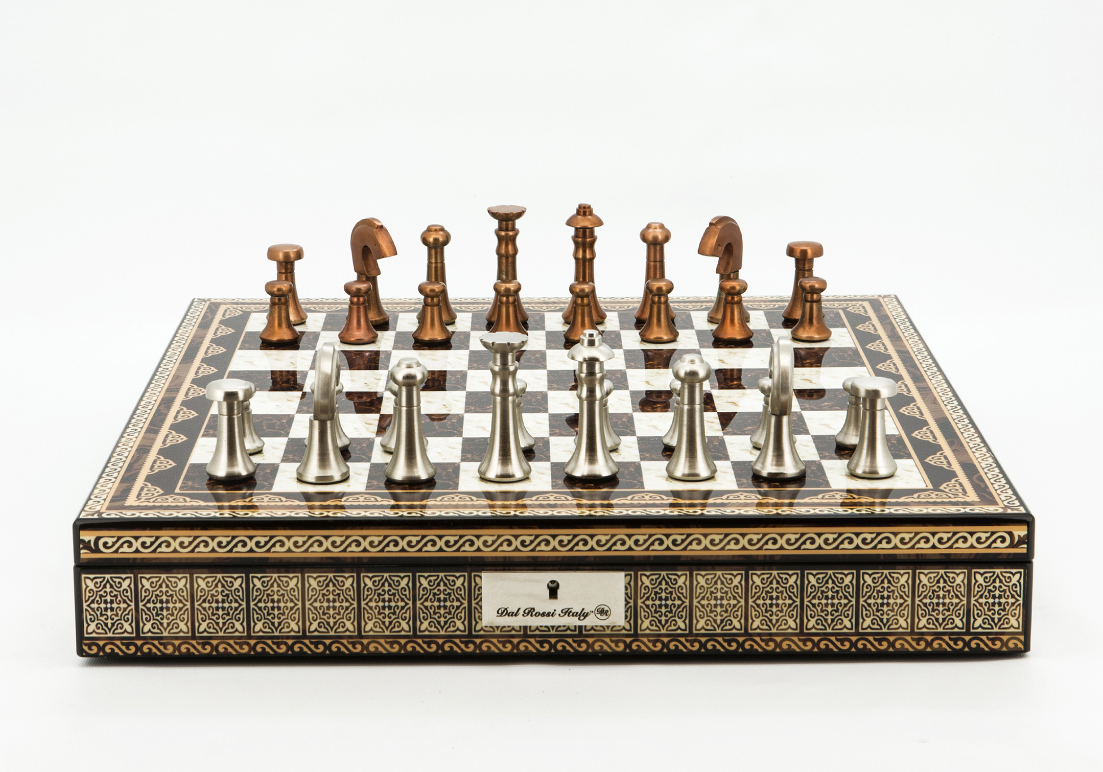 • Dal Rossi Italy Chess Set Mosaic Shinny Finish 20″ With Compartments, With Compartments, With Metal Copper and silver Chessmen 80mm