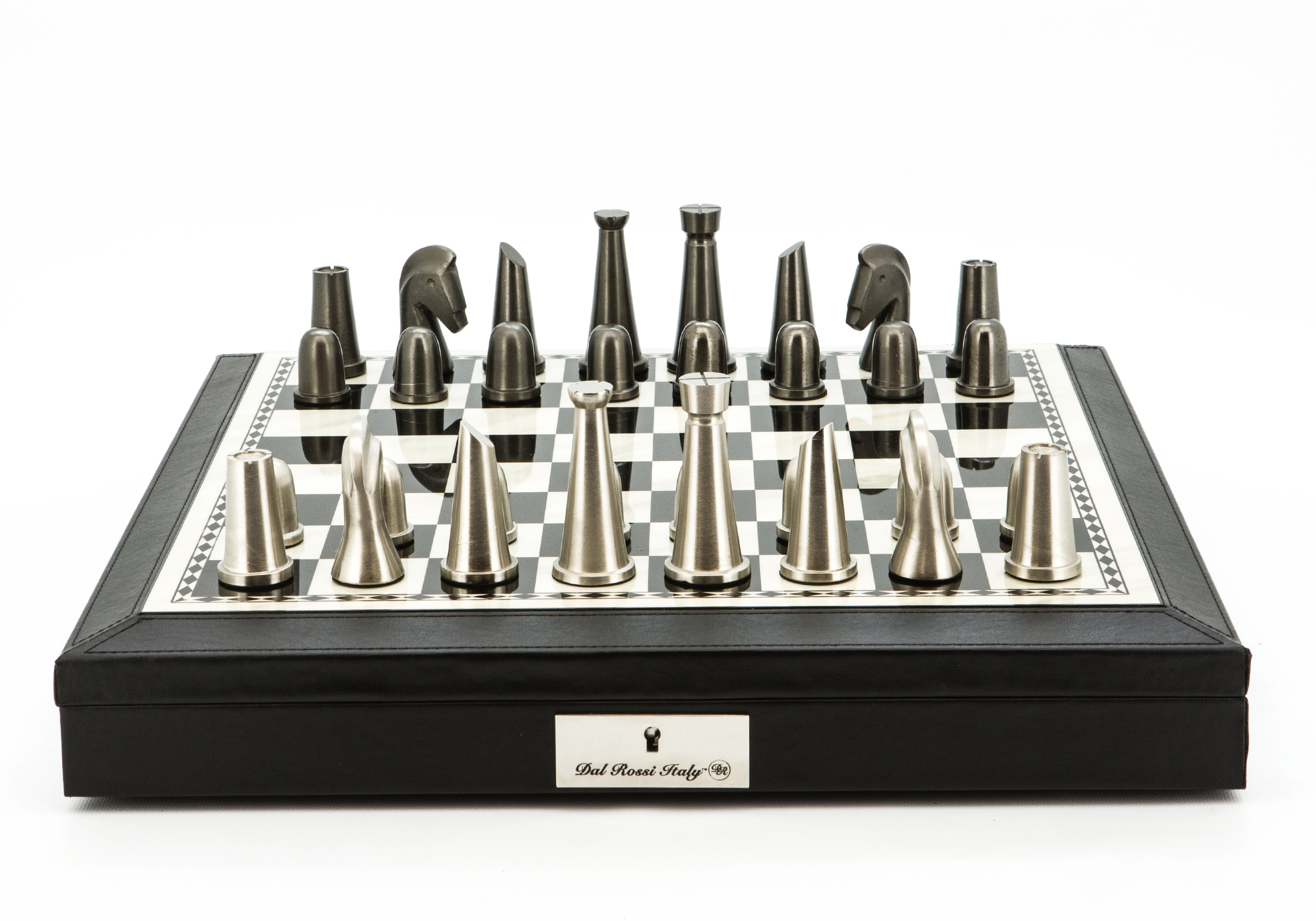 Dal Rossi Italy Chess Set 18” Black and White with Black PU Leather Edge with compartments, With Metal Dark Titanium and Silver chessmen 85mm