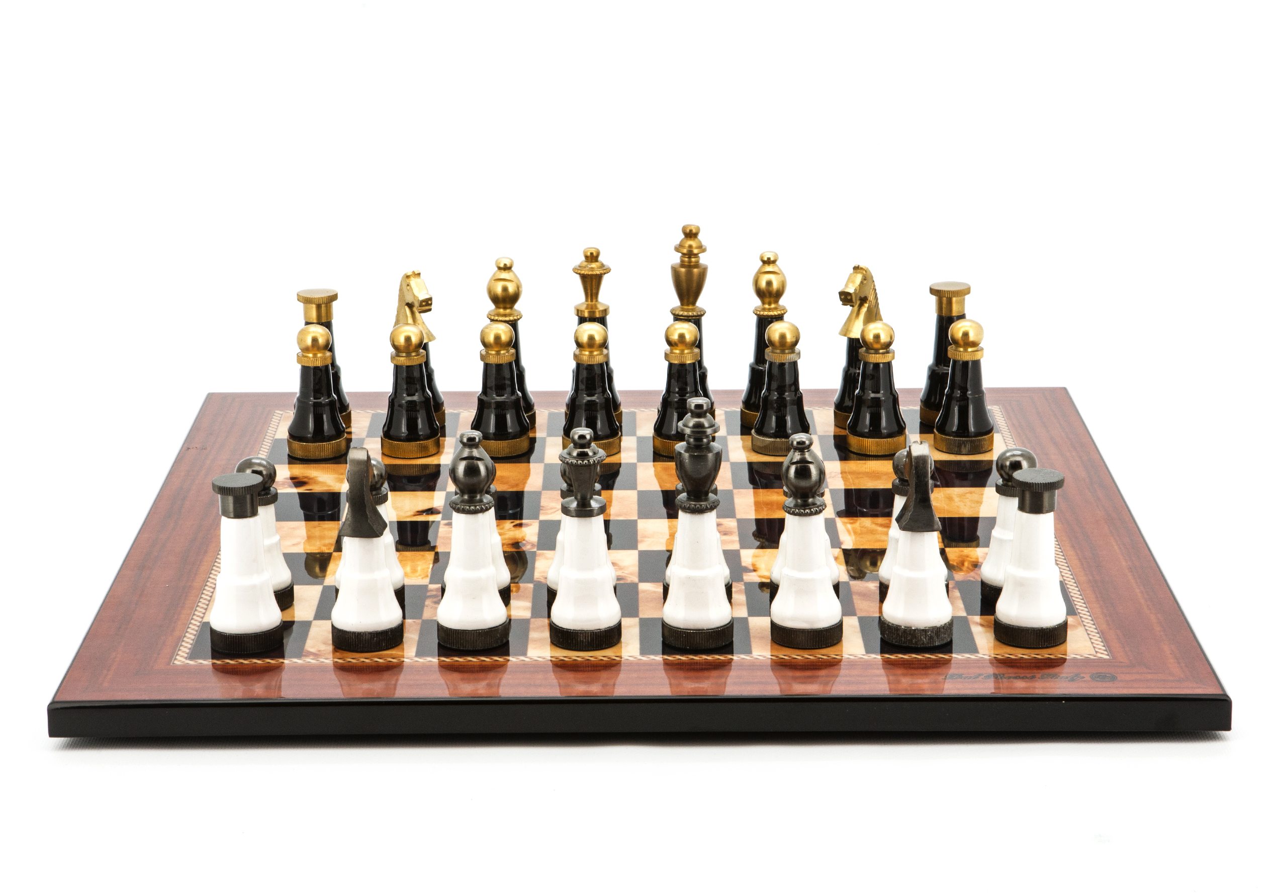 Dal Rossi Italy Chess Set Flat Walnut Finish Board 50cm,With Black and White with Gold and Gun Metal Tops and Bottoms Chessmen 110mm