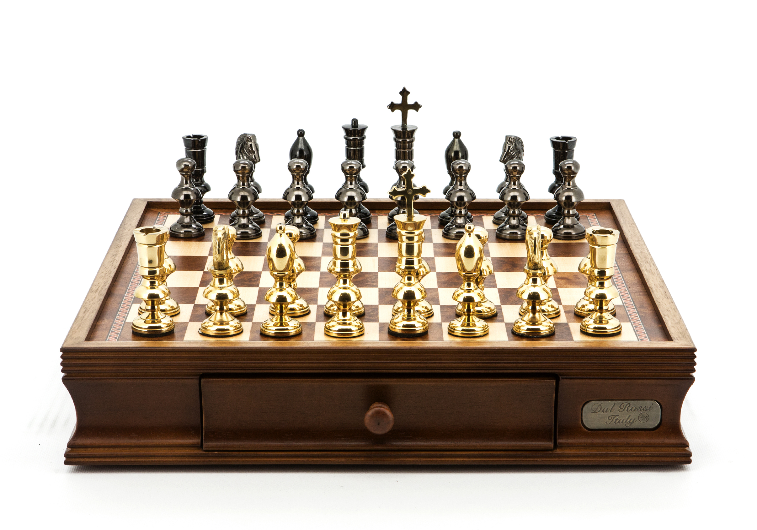 Dal Rossi Italy Chess Set Walnut Finish 16″ With Two Drawers, With Metal Dark Titanium and Gold Chessmen 110mm