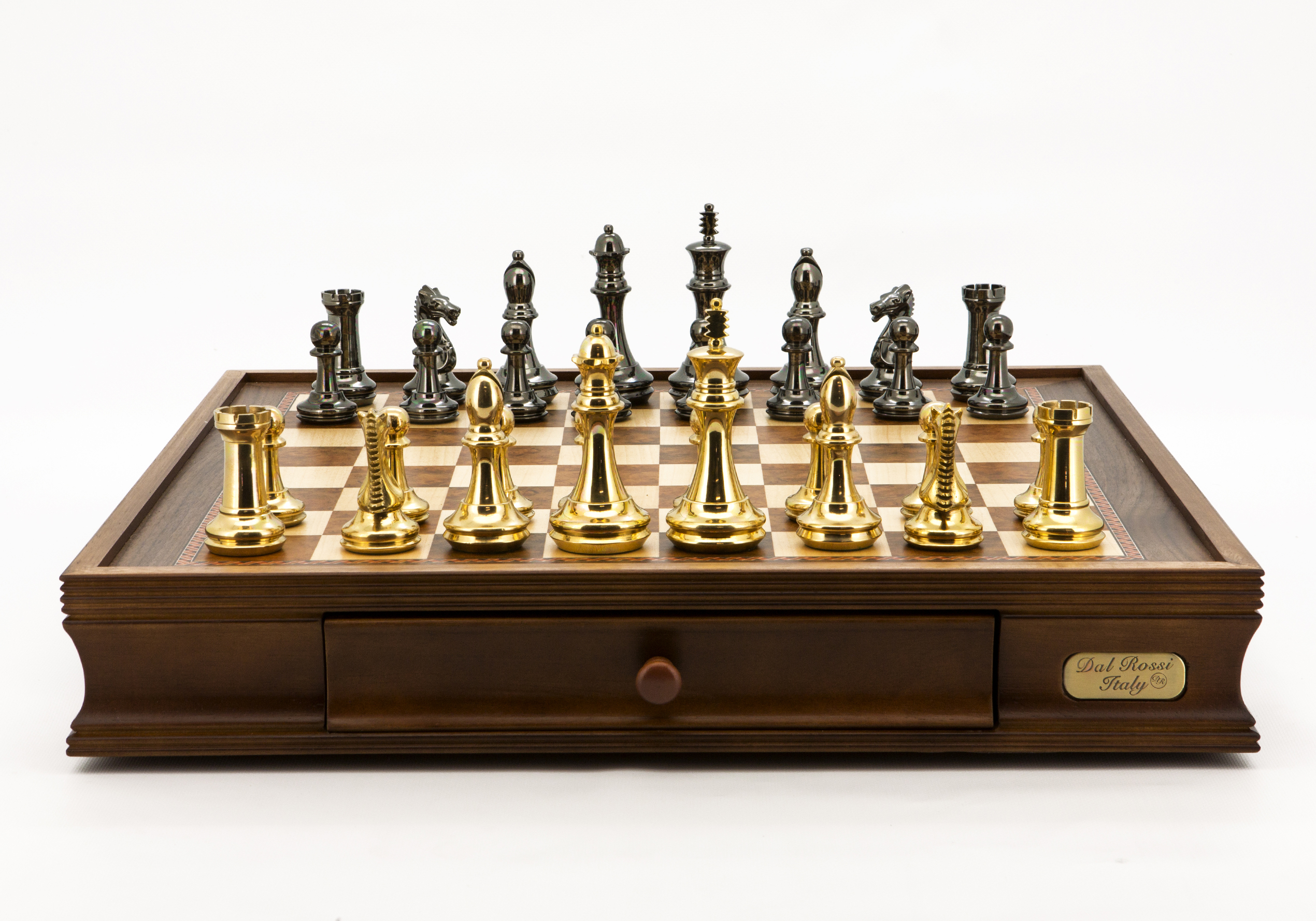 Dal Rossi Italy Chess Set Walnut Finish 20″ With Two Drawers, With Very Heavy Brass Staunton Gold and Silver chessmen 110mm