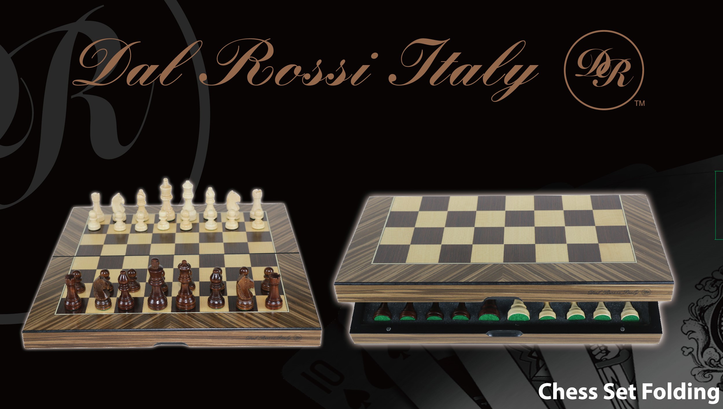 Dal Rossi Palisander / Boxwood Finish Folding Chess Set, 16" NEW