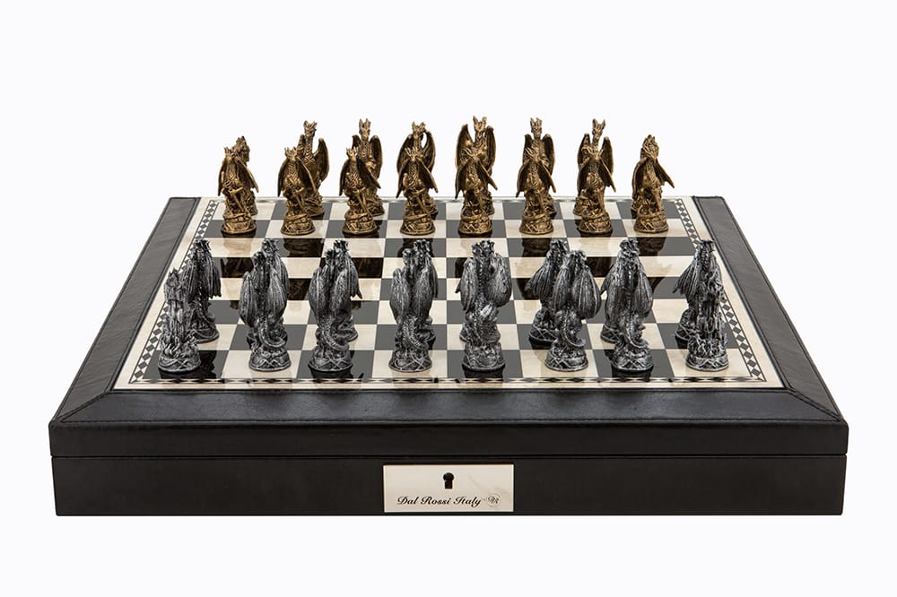 Dal Rossi Italy Black PU Leather Bevilled Edge chess box with compartments 18″ with Dragon Pewter 80mm Chessmen. Product code: L40223DR-0Hussain2021-09-25T09:12:35+00:00