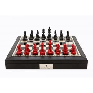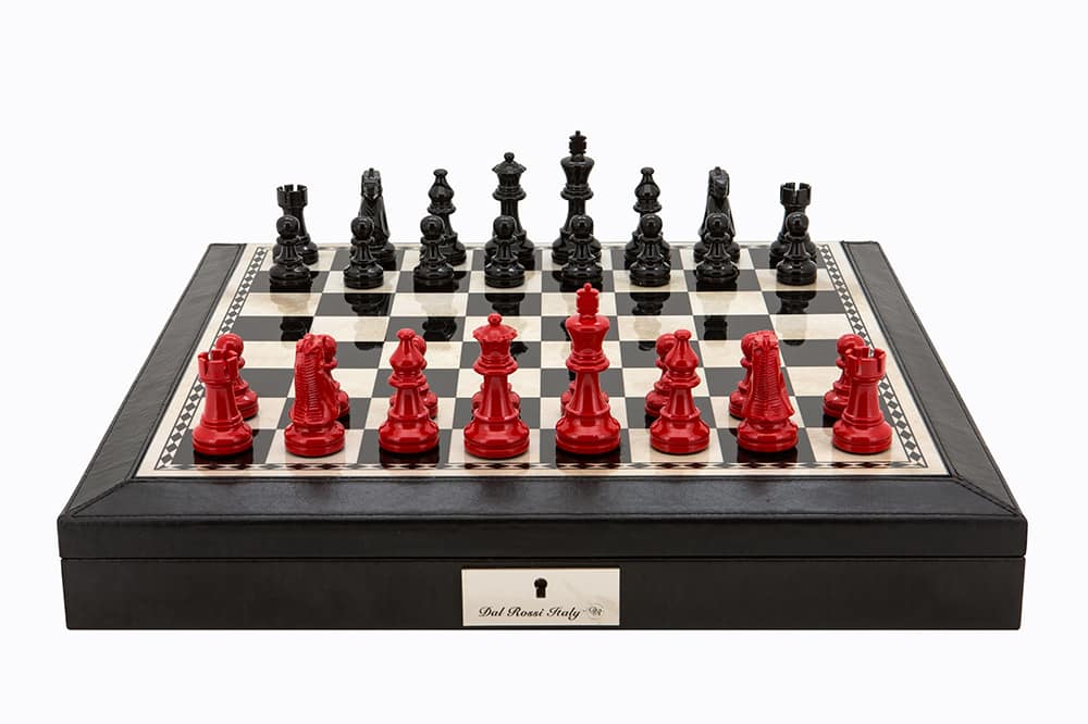 Dal Rossi Italy Black PU Leather Bevilled Edge chess box with compartments 18″ with French Lardy Black/Red 85mm Chessmen. Product code: L4070DR-0Hussain2021-09-25T09:12:34+00:00