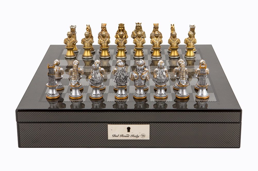 Dal Rossi Italy Carbon Fibre Shiny Finish chess box with compartments 16” with Medieval Warriors Resin 75mm Chessmen – L4438DR-0Hussain2021-09-25T09:11:50+00:00