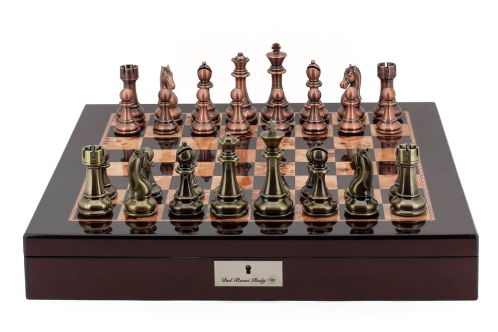 Dal Rossi Italy Chess Box Mahogany Finish 20″ with compartments Bronze & Copper 101mm Double Weighted Chess Pieces-2082