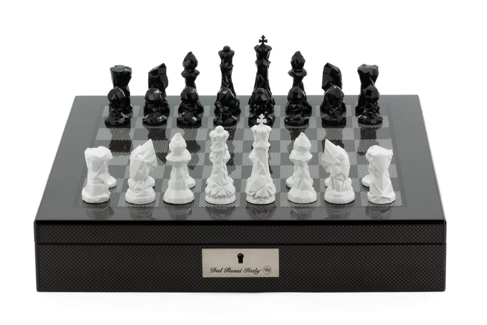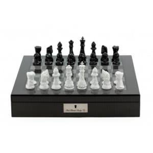 Dal Rossi Italy Chess Set with Diamond-Cut Black & White 85mm chessmen on a Carbon Fibre Shiny Finish Chess Box 16” with compartments-0Hussain2021-09-25T09:14:10+00:00