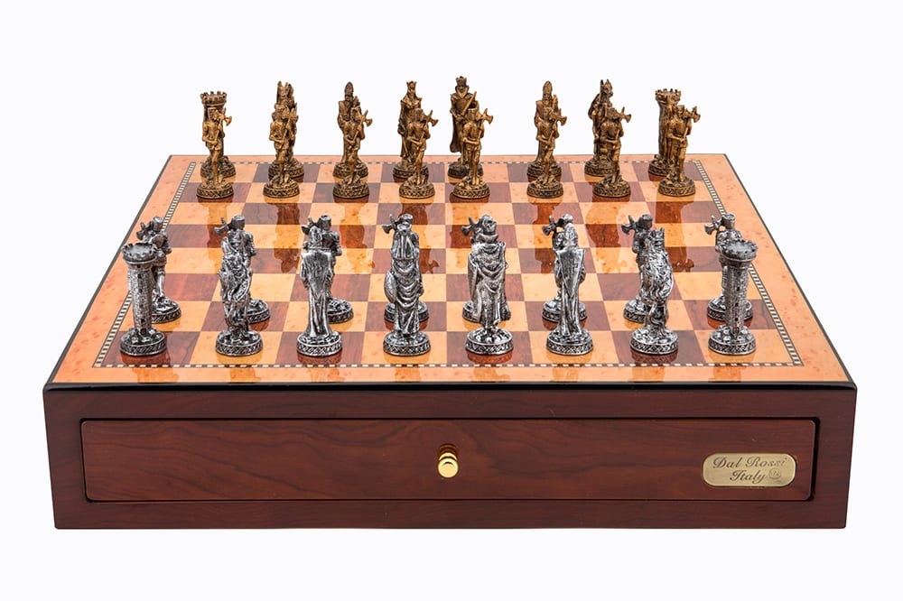Dal Rossi Italy Red Mahogany Finish chess box with compartments 18″ with Medieval Pewter 80mm Chessmen. Product code: L46222DR-0Hussain2021-09-25T09:12:38+00:00