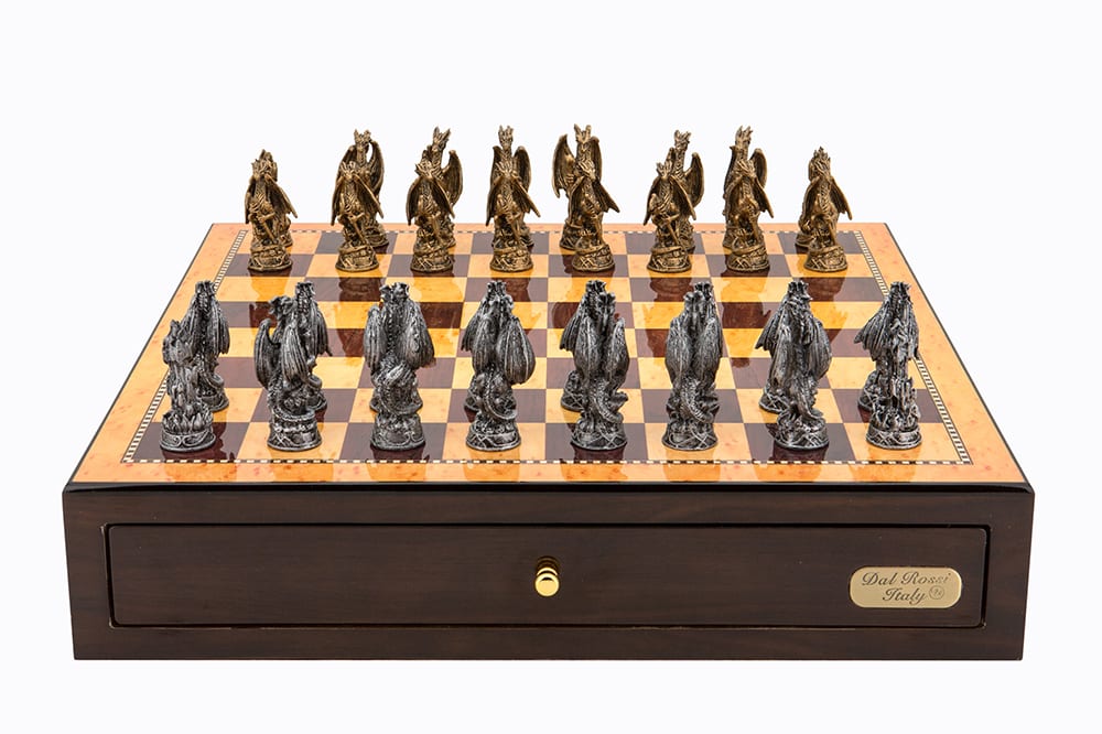 Dal Rossi Italy Walnut Finish chess box with compartments 18″ with Dragon Pewter 80mm Chessmen – L47223DR-0Hussain2021-09-25T09:12:18+00:00