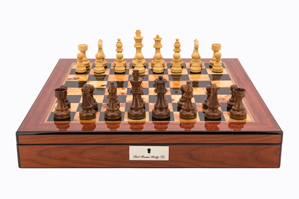 Dal Rossi Italy Walnut Finish chess box with lock & compartments 16” with Staunton Wooden 85mm Chessmen – L4210DR-0Hussain2021-09-25T09:12:25+00:00