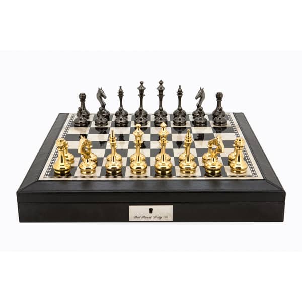 Dal Rossi Italy Black PU Leather Bevilled Edge chess box with compartments 18″ with Staunton Brass Titanium Cap Chessmen