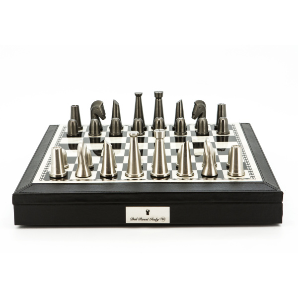 Dal Rossi Italy Chess Set 18” Black and White with Black PU Leather Edge with compartments, With Metal Dark Titanium and Silver chessmen 85mm