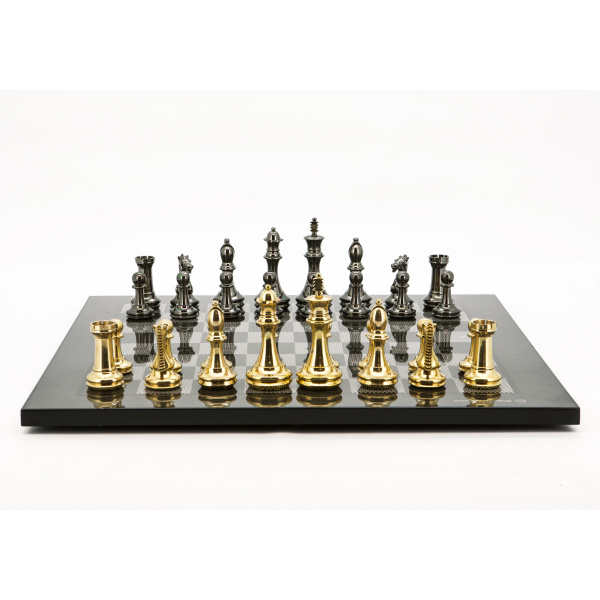 Dal Rossi Italy Chess Set Carbon Fibre Board 50cm, With Very Heavy Brass Staunton Gold and Silver chessmen 110mm