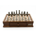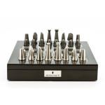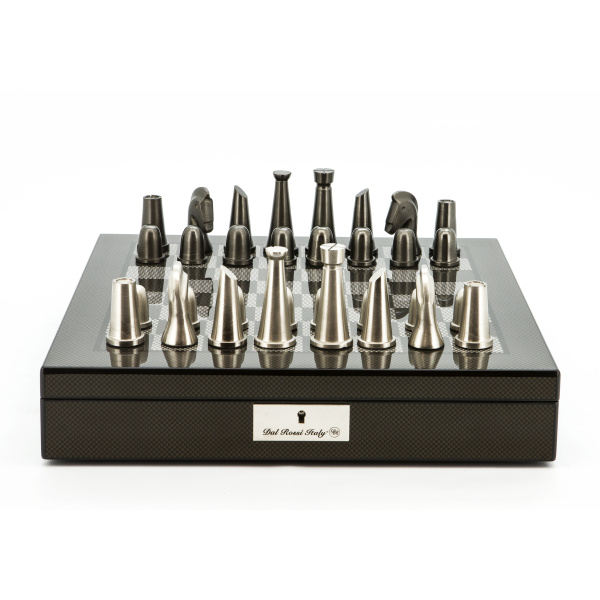 Dal Rossi Italy Chess Set Carbon Fibre Finish 16″ With Compartments, With Metal Dark Titanium and Silver chessmen 85mm