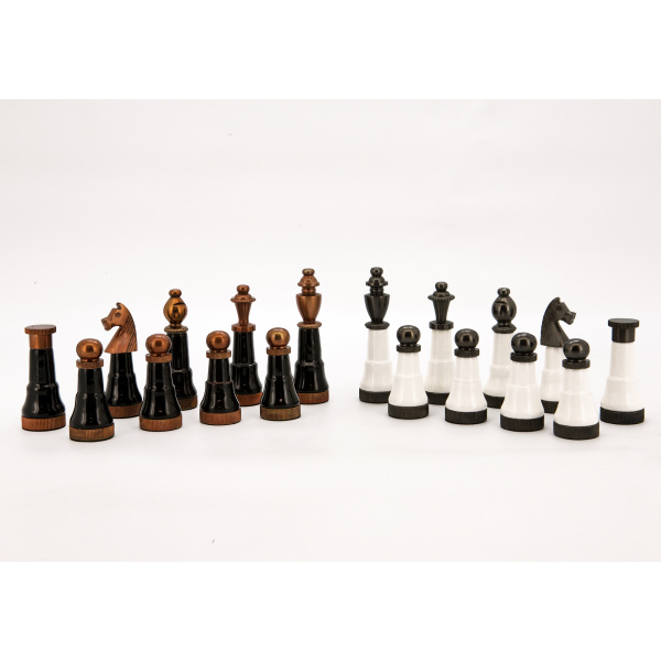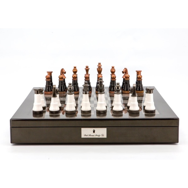 Dal Rossi Italy Chess Set Carbon Fibre Finish 20″ With Compartments,With Black and White Copper and Gun Metal Gray Tops and Bottoms Chessmen 110mm