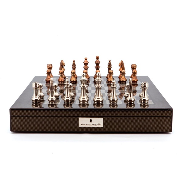 Dal Rossi Italy Chess Set Carbon Fibre Finish 20″ With Compartments, With Copper and Silver Weighted Metal Chess Pieces 100mm pieces