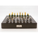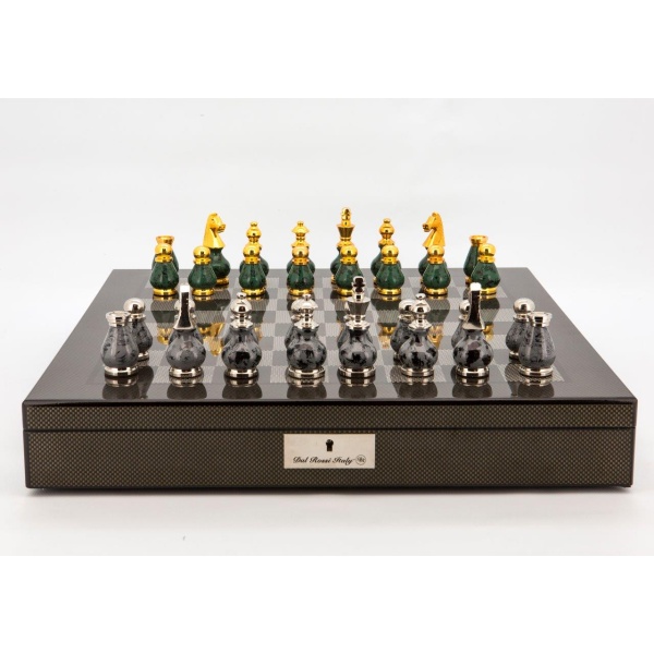 Dal Rossi Italy Chess Set Carbon Fibre Finish 20″ With Compartments, With Gray and Green Gold and Silver Tops and Bottoms Chessmen 90mm