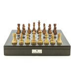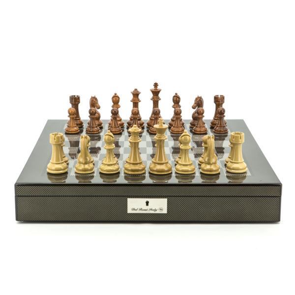 Dal Rossi Italy Chess Set Carbon Fibre Shinny Finish 20″ With Compartments, Brown and Box Wood Grain Finish 110mm Chess Pieces