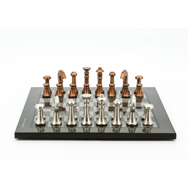 Dal Rossi Italy Chess Set Flat Carbon Fibre Finish Board 40cm, With Metal Copper and silver Chessmen 80mm