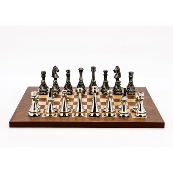 Dal Rossi Italy Chess Set Mahogany Maple Flat Board 40cm, With Metal Dark Titanium and Silver chessmen 85mm