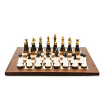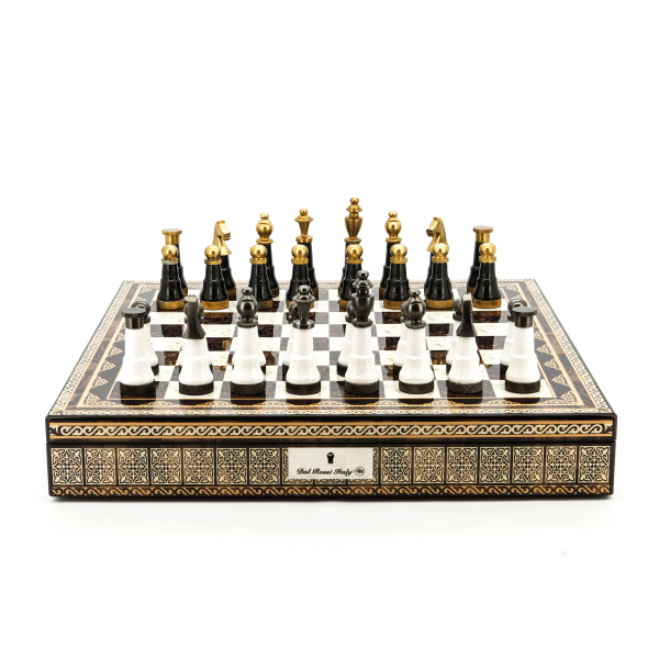 Dal Rossi Italy Chess Set Mosaic Shinny Finish 20″ With Compartments, With Black and White with Gold and Gun Metal Tops and Bottoms Chessmen 110mm