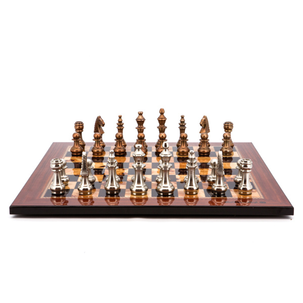 Dal Rossi Italy Chess Set Walnut Finish Flat Board 50cm, With Copper and Silver Weighted Metal Chess Pieces 100mm pieces