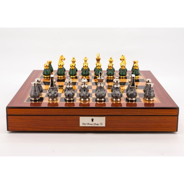 Dal Rossi Italy Chess Set Walnut Finish 20″ With Compartments, With Gray and Green Gold and Silver Metal Tops and Bottoms Chess Pieces 90mm