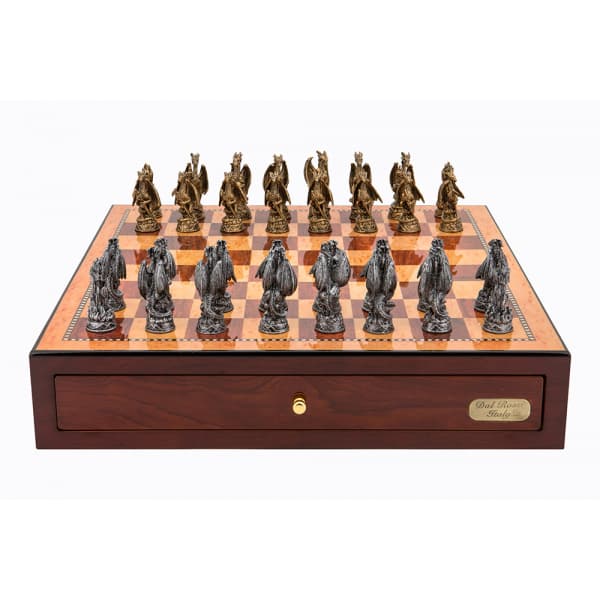 Dal Rossi Italy Red Mahogany Finish chess box with compartments 18″ with Dragon Pewter Chessmen