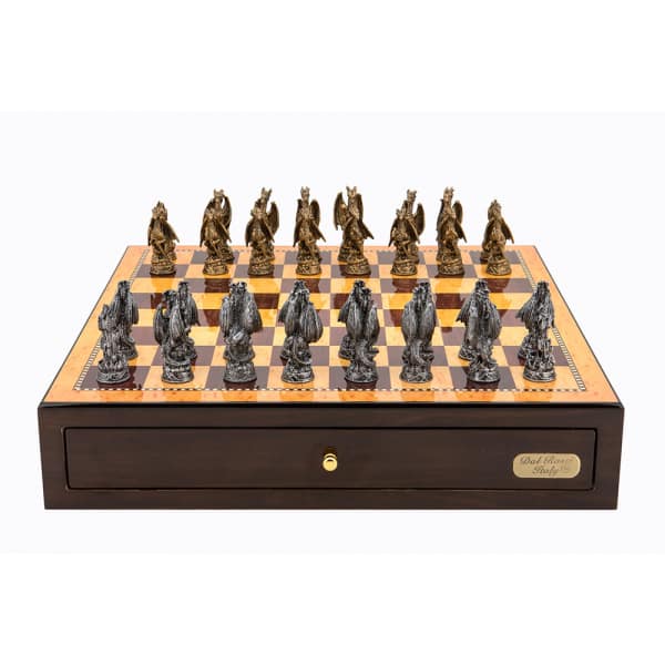 Dal Rossi Italy Walnut Finish chess box with compartments 18″ with Dragon Pewter Chessmen