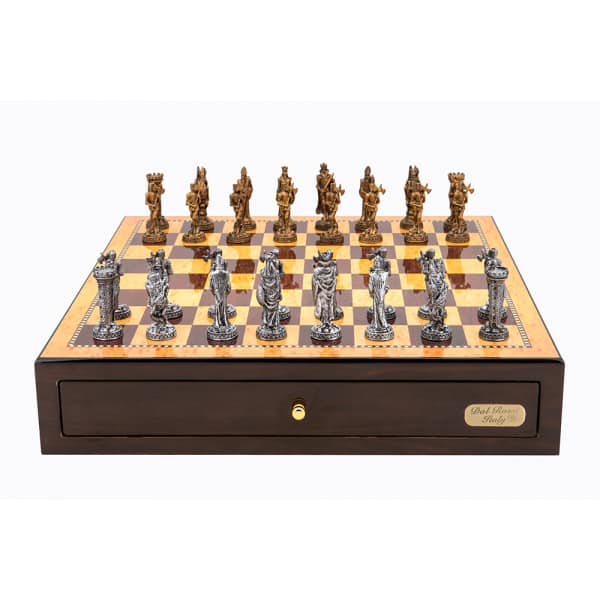 Dal Rossi Italy Walnut Finish chess box with compartments 18″ with Medieval Pewter Chessmen