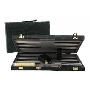 Grey 15″ Backgammon Set in a vinyl Case includes quality backgammon pieces, dice and cup.
